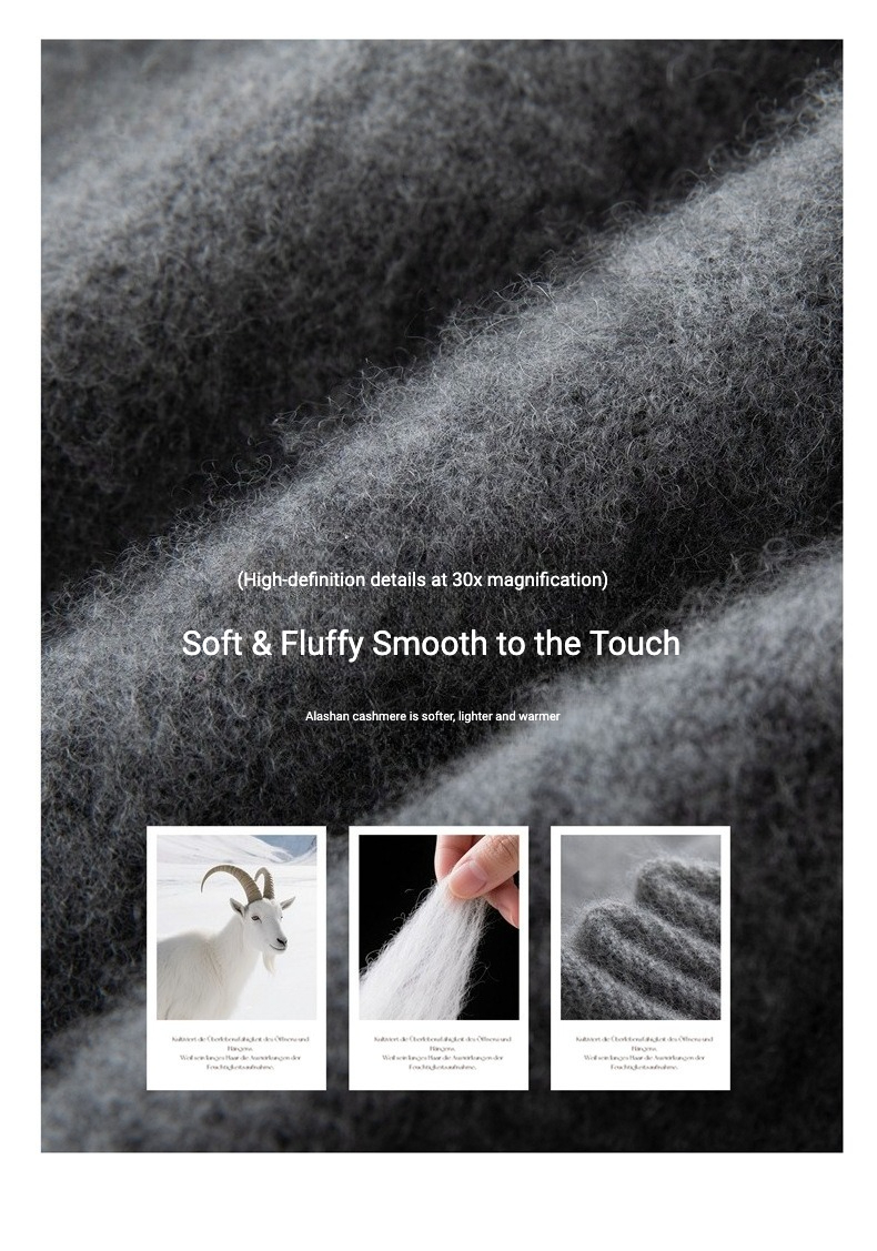 Spun from the first combing of Albas baby goats, the fibre measures under 14 micron, delivering silk-like glide and zero itch. The relaxed polo collar drapes in a gentle roll that frames the collarbone without clinging to the neck, Extended rib cuffs cover half the hand, locking warmth while adding a loungewear attitude.